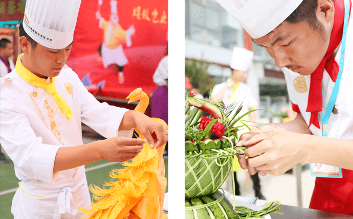 果蔬雕刻,又称餐桌上的艺术。以常见的蔬菜、瓜、果为原料,通过切、旋、削、戳、刻等手法,把它变成玲珑剔透、栩栩如生的花卉、走兽、人物、风景,化平凡为神奇,使得大宴小酌面目一新,给人一种充满情趣的餐饮气氛。